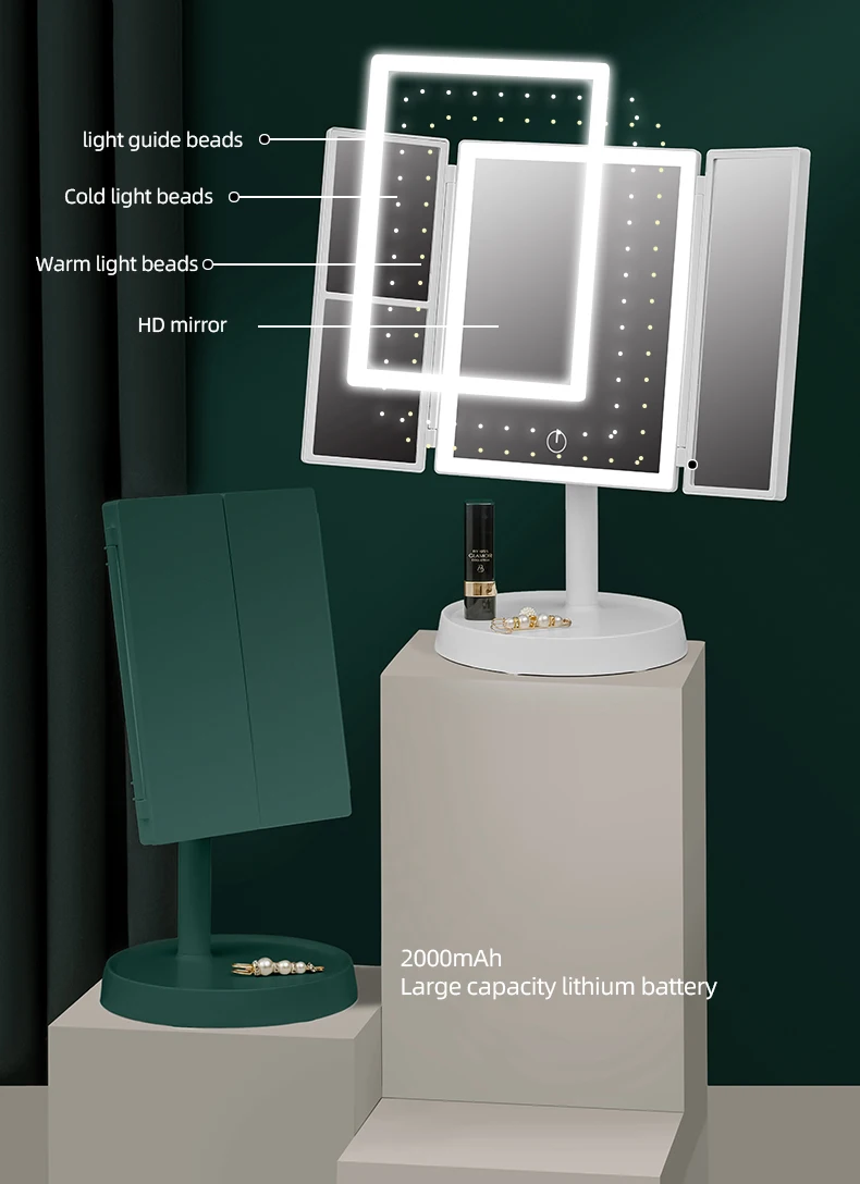 Miroir de Maquillage Pliable LED avec Écran Tactile : 3 Lumières, Grossissement 2X/3X, Rotation 360°, Rechargeable et Ajustable